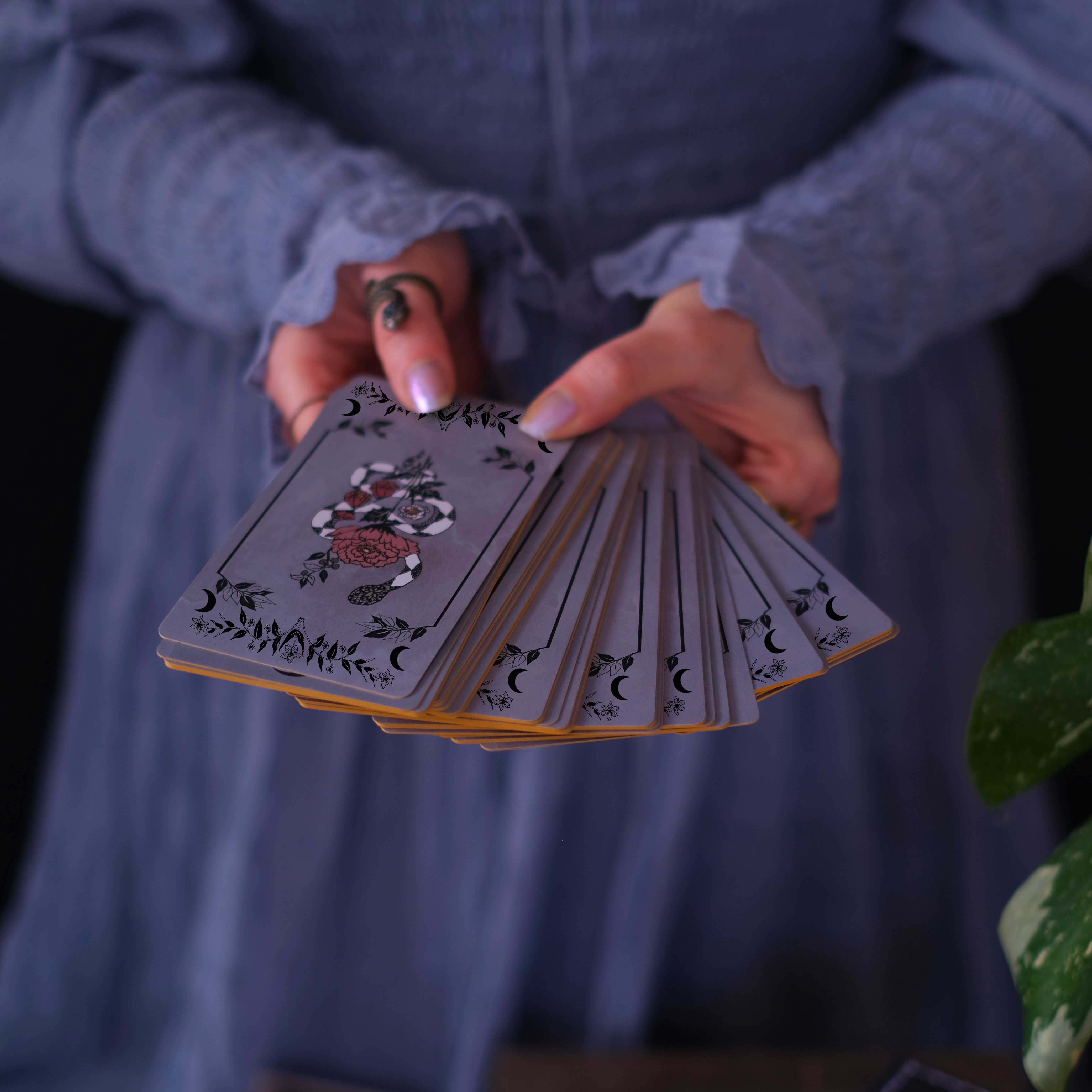 Botanical Tarot deck and Botanical Oracle deck cards illustrated by hand and rooted in botanicals, the natural world, flora, the plant kingdom, and the garden. Each of these decks are an ode to the garden journey, to transformation, to empowerment.Rooted in mythology and infused with plant magic, we invoke the myth of the Pythia, an ancient priestess whose visions channeled prophecies from Hellenic gods. Also known as the Oracle of Delphi, her divinations were steeped in mystery and enigmatic wonder―a trusted presage that loomed in the hearts of all who sought to persist against fate.